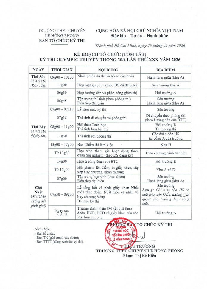 Kế hoạch tổ chức (tóm tắt) Kỳ thi Olympic truyền thống 30/4 lần thứ XXX năm 2026